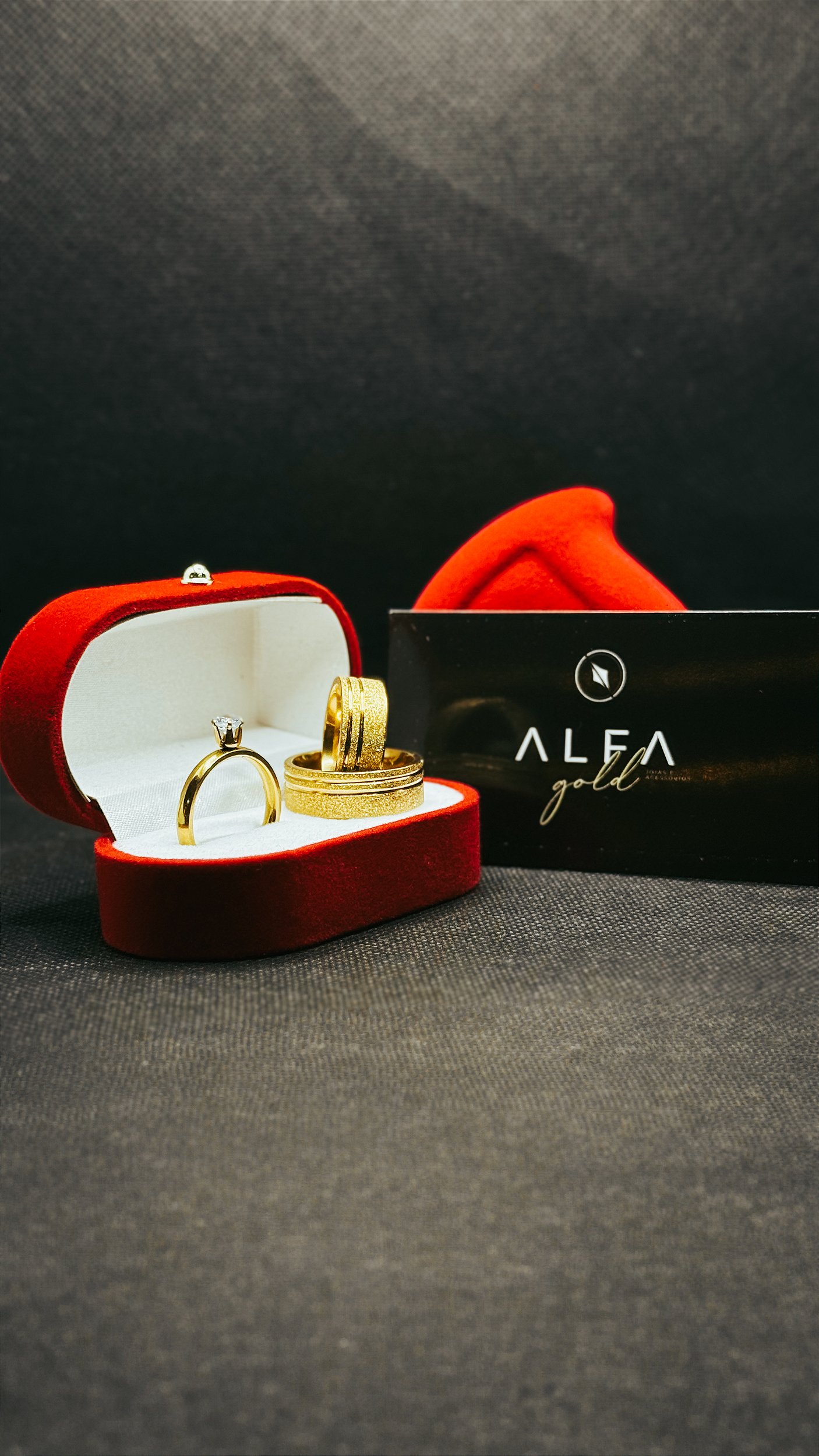 Este par de alianças douradas com 2 frisos diamantados foi criado para casais que valorizam elegância e significado em cada detalhe.