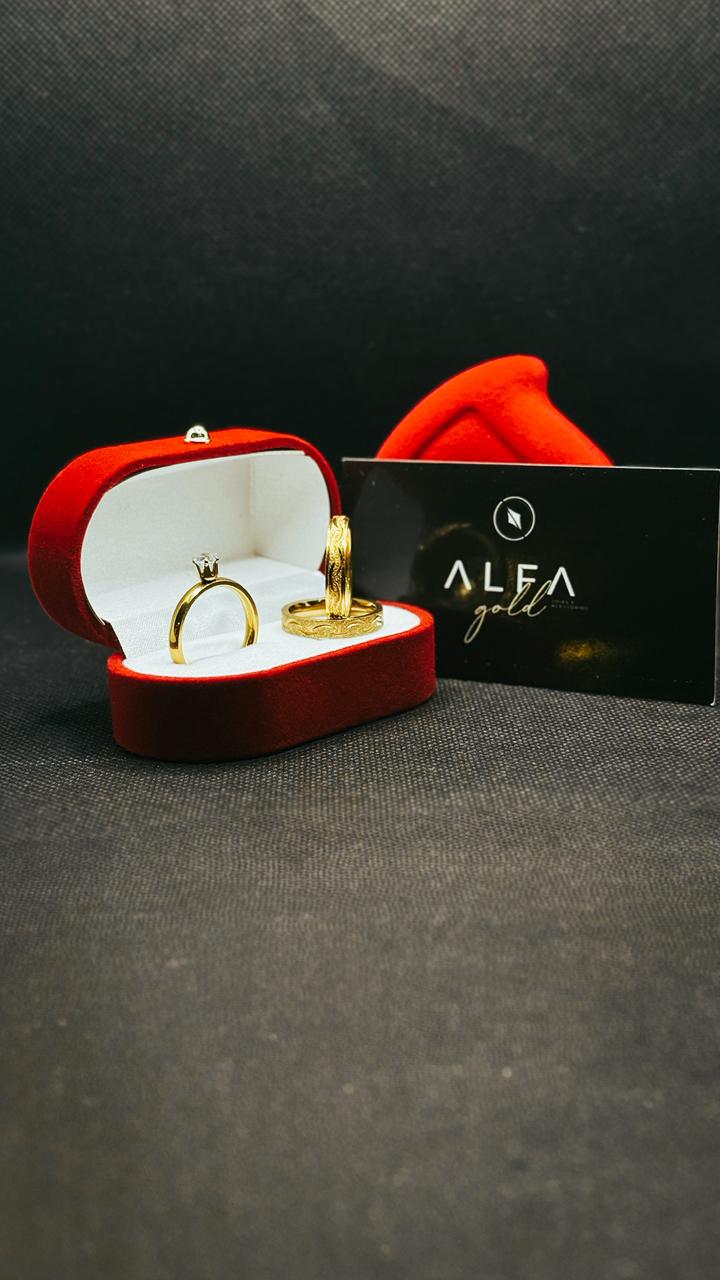 Para um toque especial, uma das alianças é adornada com uma zircônia cuidadosamente cravada, representando o valor e a beleza de uma união verdadeira.